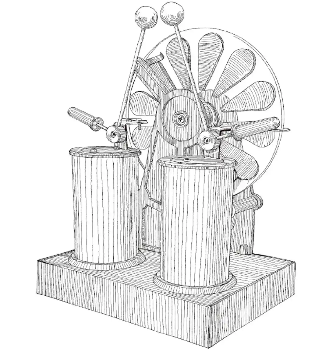 | ウイムズハースト式感応起電機は、1883年にイギリスのジェイムズ・ウイムズハーストによって発明された、電気科学史を象徴する実験装置です。当時、すでに静電誘導による静電起電機は存在しましたが、電気を起こすことにおいて、ウイムズハースト式感応起電機ははるかに信頼性が高く、研究室での電気実験に活躍しました。 | |||