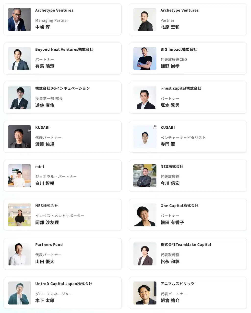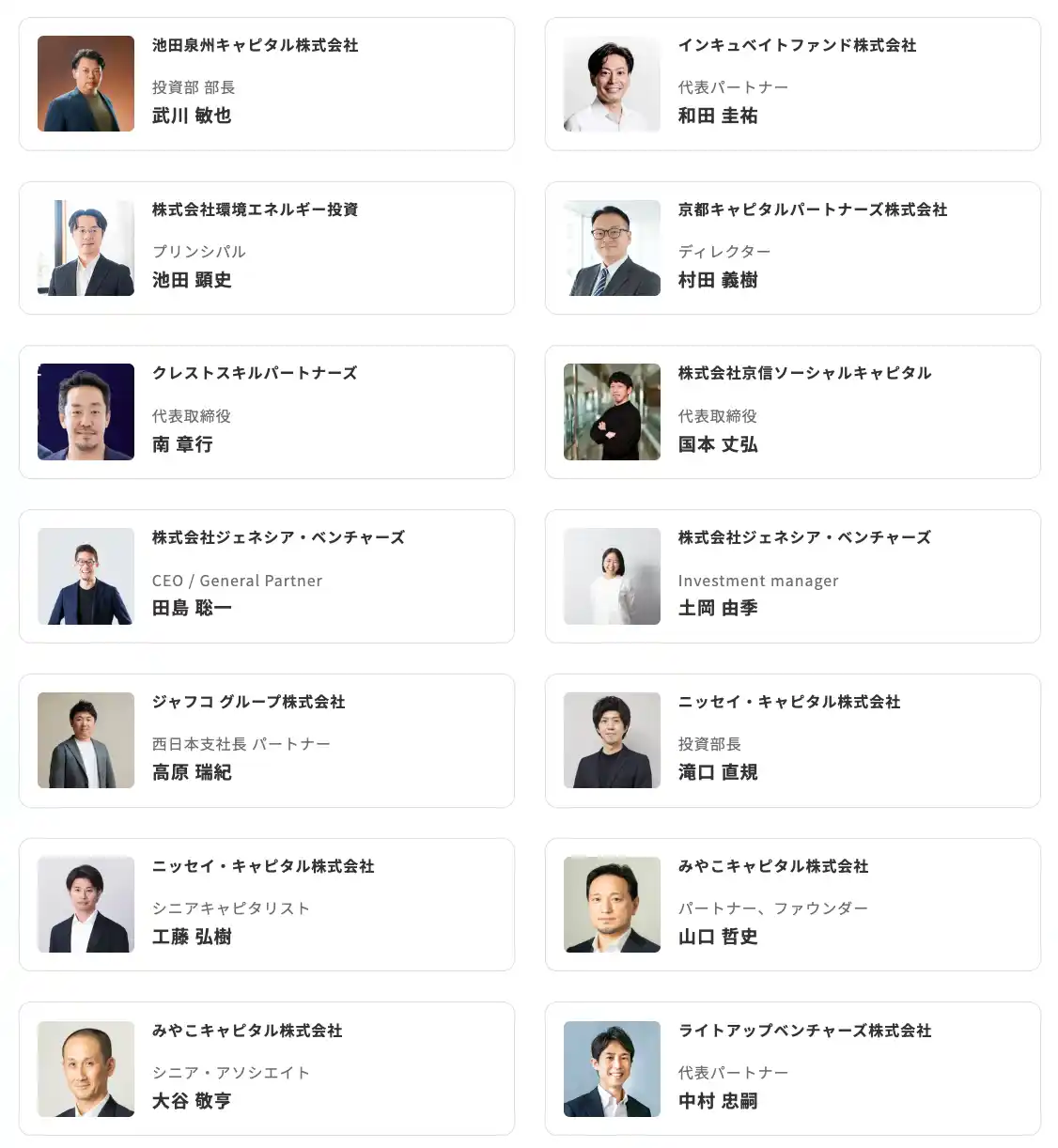 | また国内の有力ベンチャーキャピタル24社より、GP・パートナークラスを中心とした約30名のキャピタリストが関西に集結し、関西発スタートアップとの1on1面談を実施します。これだけ多くの有力投資家が一堂に会し、スタートアップと集中的に対話する機会は国内でも極めて稀であり、本プログラムは国内最大級の資金調達面談プログラムとなります。 | |||||||||||||||||||