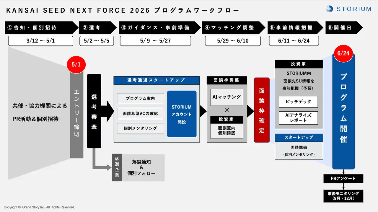 本プログラムは、イノベーション・プラットフォーム『STORIUM(ストリウム)』を運営する株式会社グランストーリー(所在地:東京都港区、代表取締役CEO:越智 敬之)が、地域発の有望スタートアップに投資家との最良の出会いの機会を届けることを目指して企画・主催するものです。 開催3年目となる本年は、過去最多となる24社・30名の有力ベンチャーキャピタリストが参加。これほど多くの投資家が一堂に会し、スタートアップと個別面談を行う機会は国内でも極めて稀であり、本プログラムは国内最大級の資金調達支援プログラムとなります。 |