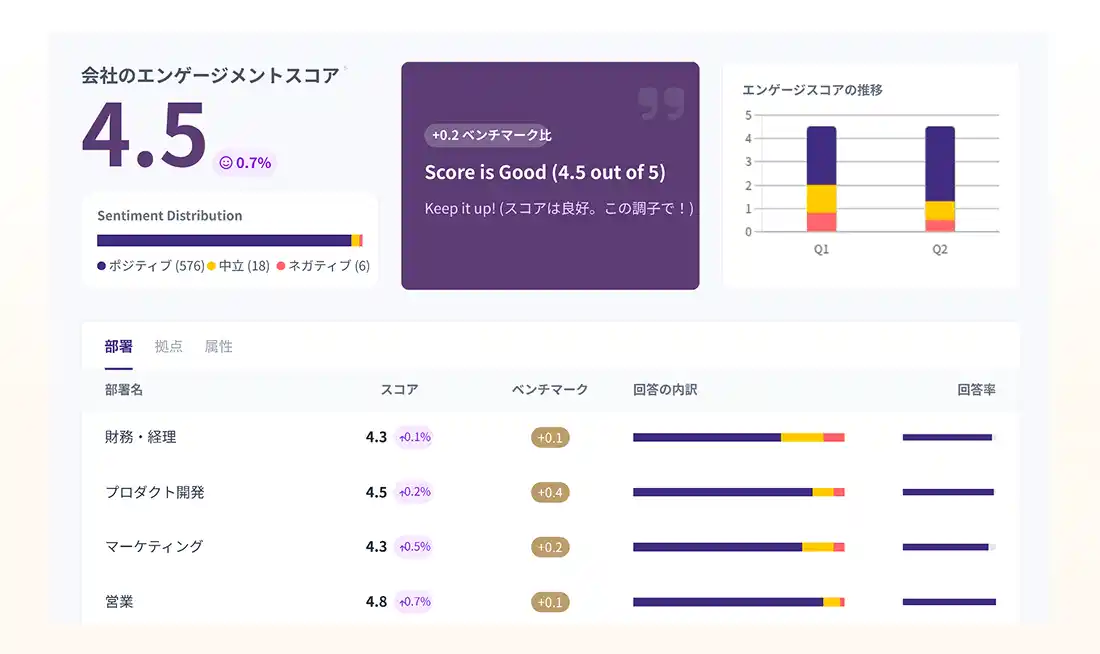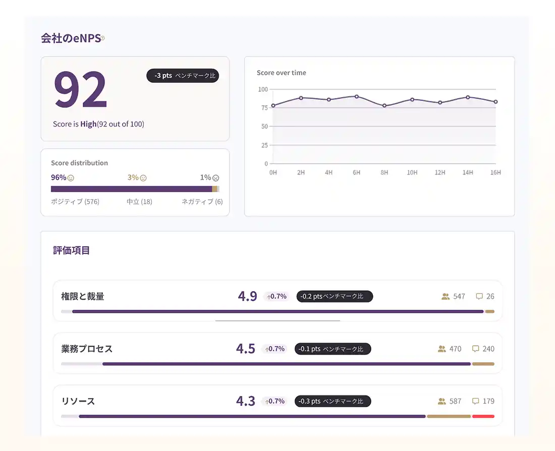 また、組織横断でのスコア比較・分析も、集計に時間を要することなくリアルタイムで行えるため、施策の実行から効果の検証までをスピーディに行うことが可能です。 |