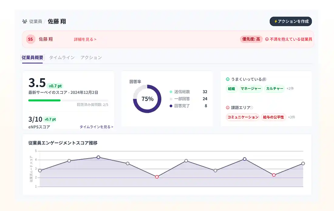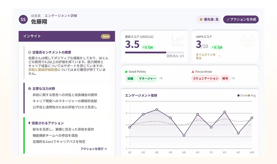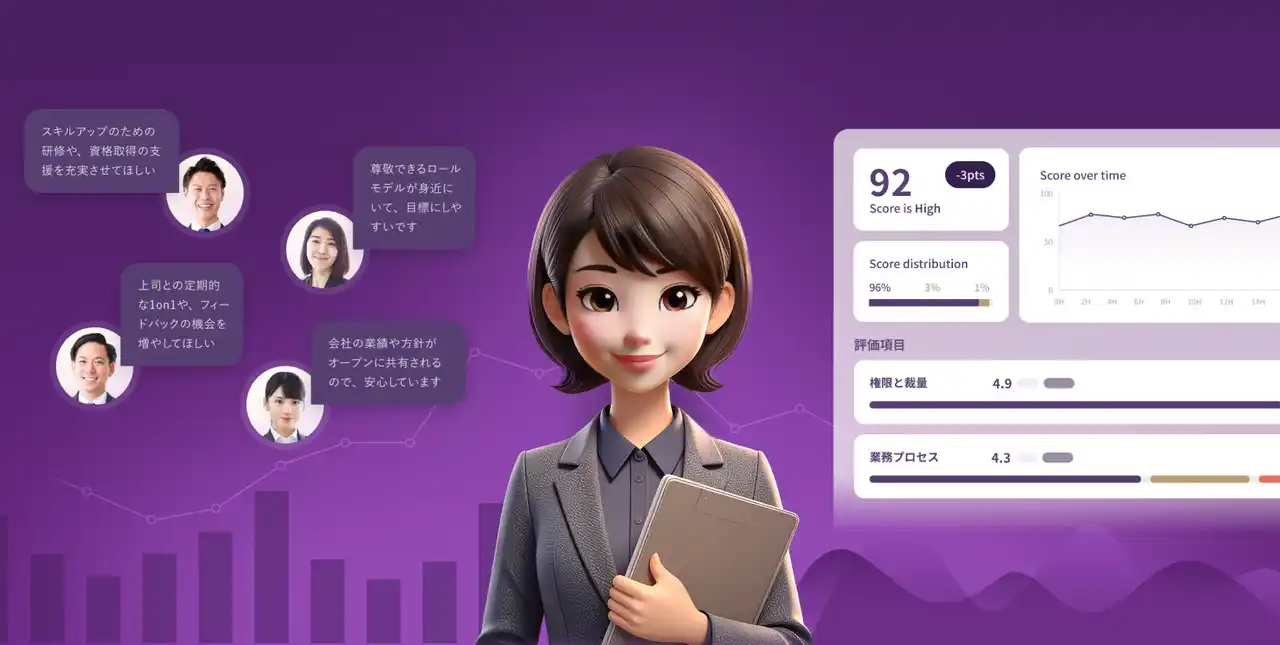 組織全体のデータを等しく分析し、客観的なデータに基づいた意思決定を行えることにより、社員が「自分の声が届いている」「組織が確実に変わっている」という実感を抱き、組織に対する自発的な貢献意欲と信頼が醸成され、エンゲージメント向上と離職防止につながります。 |