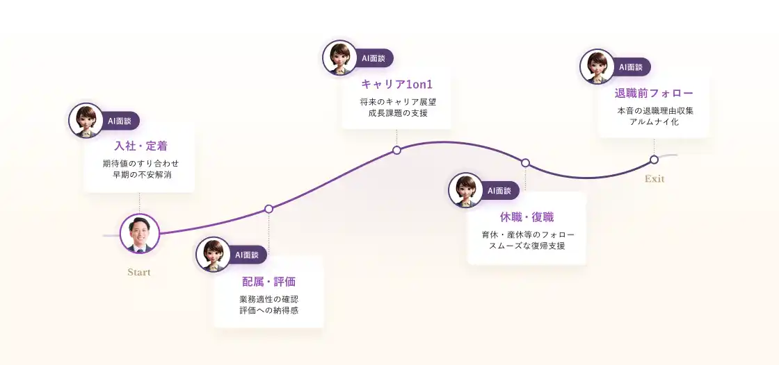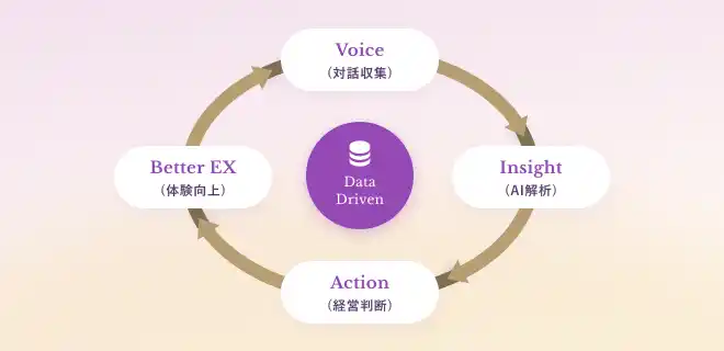 本サービスの面談では、違和感のない自然な音声対話と、相手がAIであることによる率直な自己開示を可能とし、社員の本音を引き出します。さらに、AIが個人・組織の状態を分析し、組織の課題や改善のヒントを可視化します。現場の声がより直接的に施策や改善に結びつきやすくなり、社員にその実感が生まれることで、エンゲージメント向上と組織力強化の好循環を実現します。 |