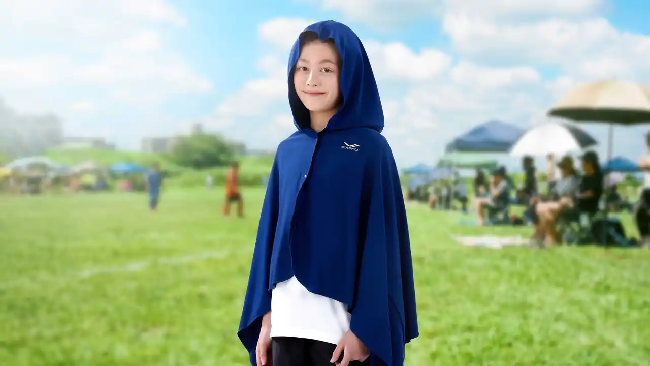 上半身をすっぽりと覆える大きさで、フードをかぶれば頭から顔まわりまでガードできます。屋外でのスポーツ観戦やフェスなど、暑さの厳しいシーンでの使用におすすめです。スポーツをするお子様の暑さ対策としても活躍します。 |