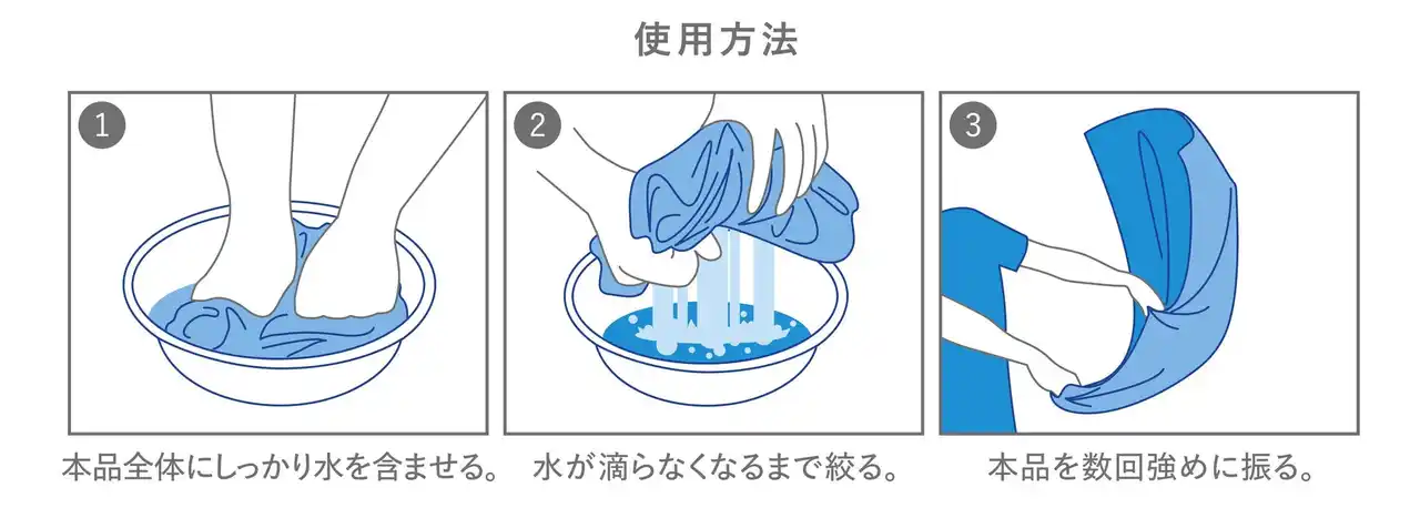 本シリーズは“濡らして、絞って、振るだけ”の簡単アクションで繰り返し冷感を得られる設計で、大人から子供まで幅広い年代にお使いいただけます。 |