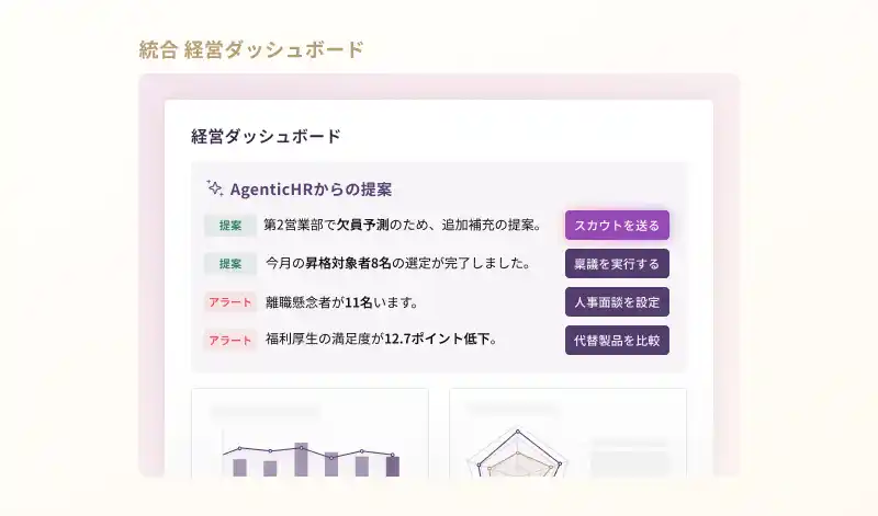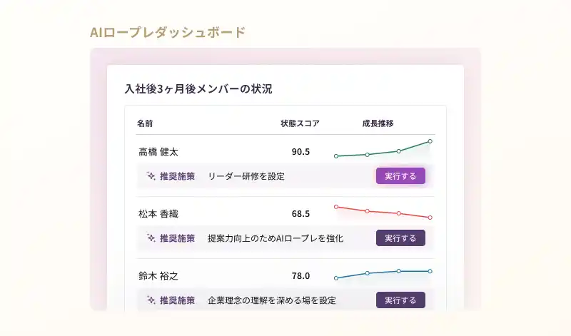 AI面接、AIロープレ、AI面談それぞれの情報を一覧化するだけでなく、AIエージェントが自動で情報分析し、次に取るべき経営判断を提案します。 |