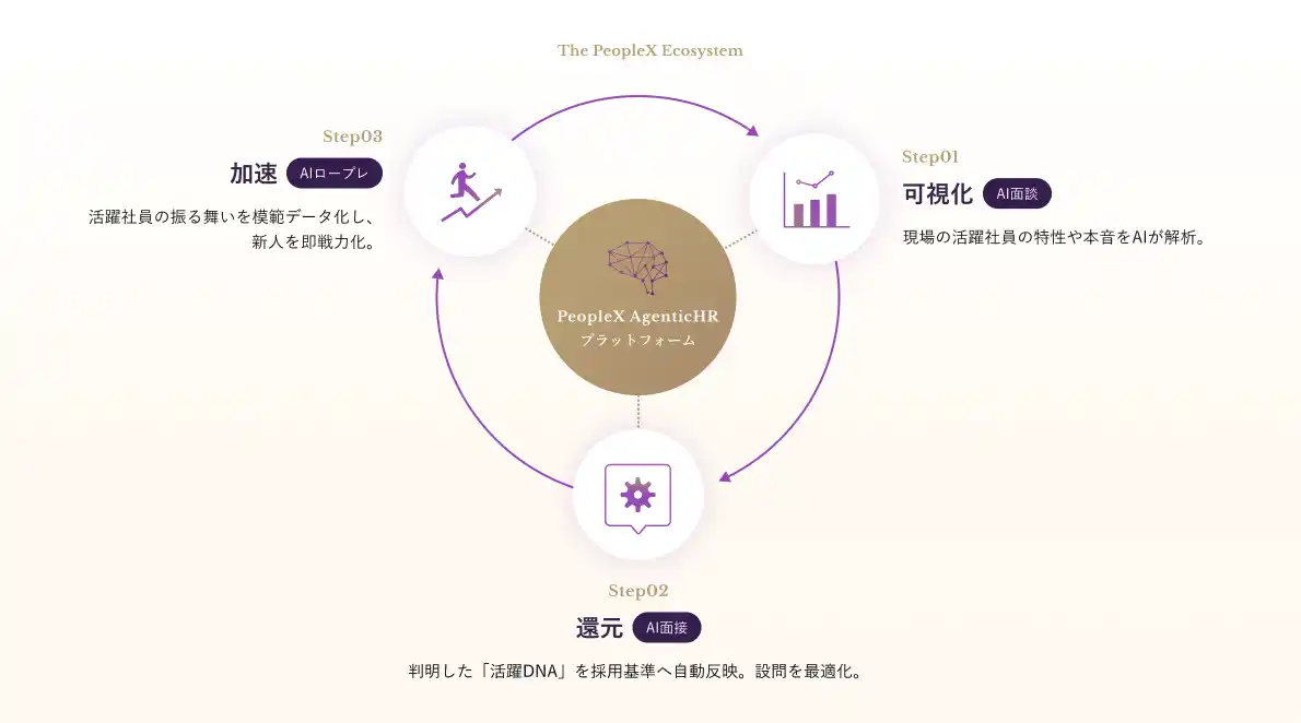 第一弾として、自社製品である「PeopleX AI面接」「PeopleX AI面談」及び「PeopleX AIロープレ」を相互連携することで、「組織と個人の特性」を「採用や育成」に最大限活用可能にするプラットフォーム環境の提供を開始いたします。 |