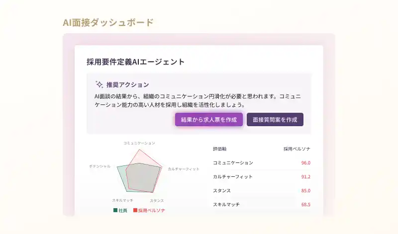 社内AI面談の結果から、今組織に必要な人材の採用要件を定義し、求人票まで自動で作成します。また、見極めに必要な面接質問や、想定回答集まで提案します。 |