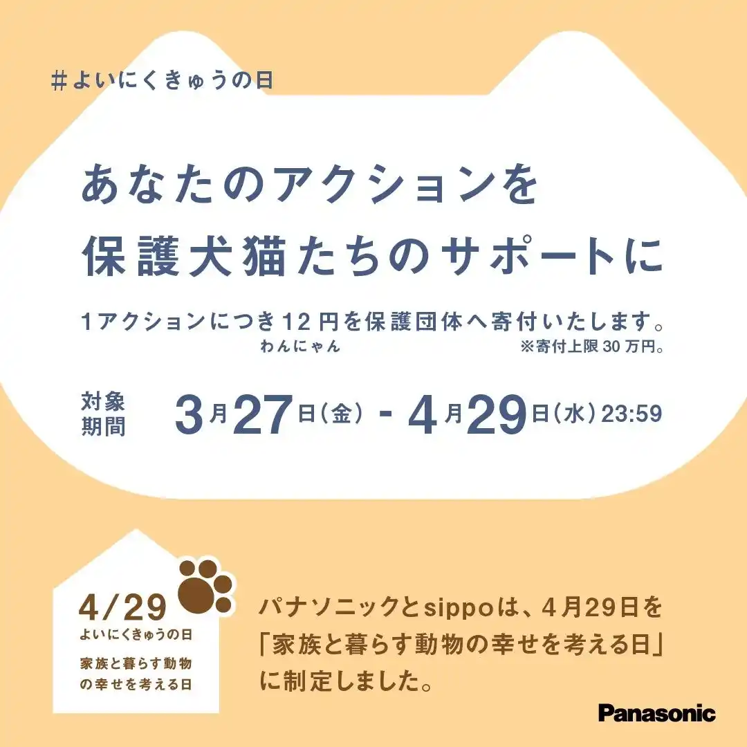 | 3月27日(金)にパナソニック公式SNSから発信予定のキャンペーン告知の投稿へのいいねやリポスト、または本イベントへの応援メッセージとハッシュタグ「#よいにくきゅうの日」をつけて投稿・リポストなどのアクションをしていただくと、1アクションにつき12円(ワンニャン円)を、パナソニックから動物保護団体に寄付します。 | |||