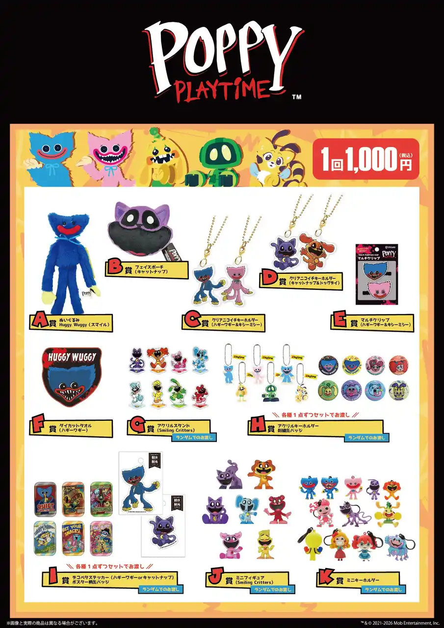 ぜひ「ハピネットゲームフェス!2026」へご来場いただき、「Poppy Playtimeくじ」でお気に入りのアイテムを手に入れるチャンスをお楽しみください。 |