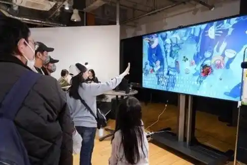 自分が描いたクラゲの絵に命が吹き込まれ、スクリーンに映る海の中で、自分の手を認識させ指を動かすことでクラゲをつかまえ大きくしたり動かしたりする遊びを楽しみました。自分の作品がスクリーンに投影されると、「あ!私の描いたクラゲが泳いでる!」と大きな歓声が上がり、自分の手が認識されてクラゲが生まれる体験を通じて科学とテクノロジーとアートの狭間を楽しむ機会となりました。 |