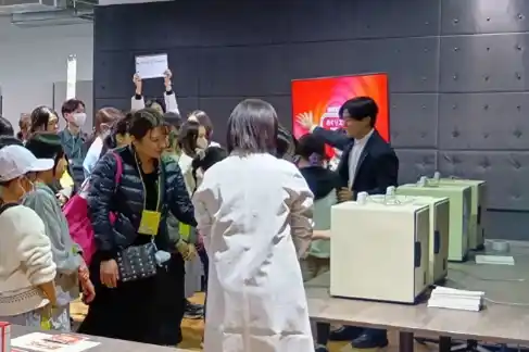 ブースに用意された「蒸気のない空気」と「蒸気のある空気」が満たされたそれぞれの箱に手を入れ、その肌感覚の違いを直接体感。専門家から「なぜ蒸気があるとより温かく感じるのか」という熱伝導の仕組みや、一つの商品を作る裏側で繰り返される緻密な比較実験・試験について詳しい解説がありました。子供たちは、「蒸気があると、じんわり深く温まる感じがしてびっくりした!」と目を輝かせていました。 |