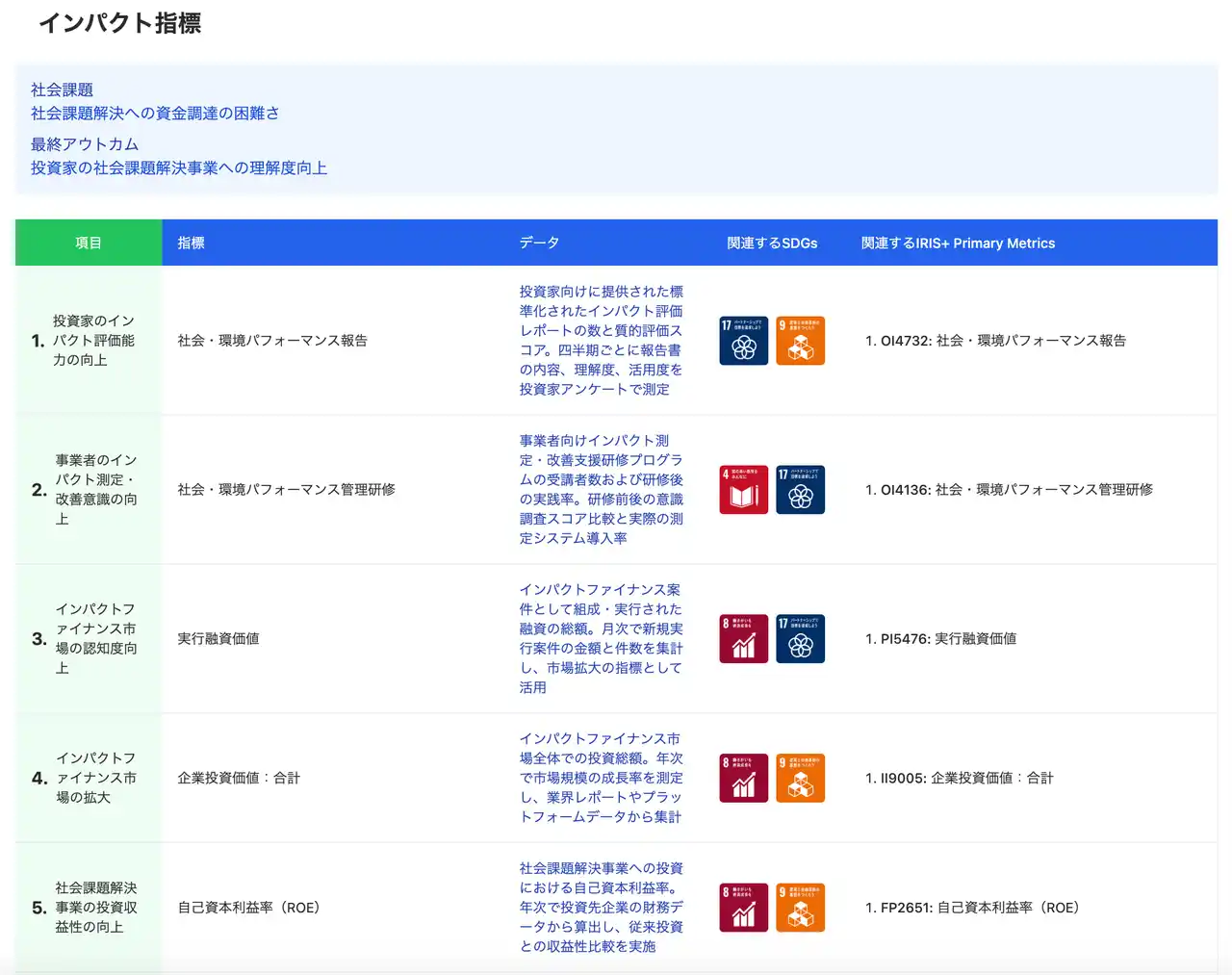 近年、インパクト投資や事業の社会貢献性を情報発信する取り組みとして、インパクト可視化やインパクト情報開示が加速しております。 |