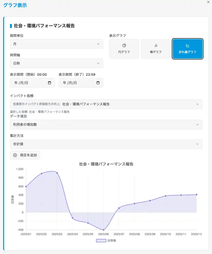 インパクトデータの集計、分析、管理、グラフ表示が可能な機能 |