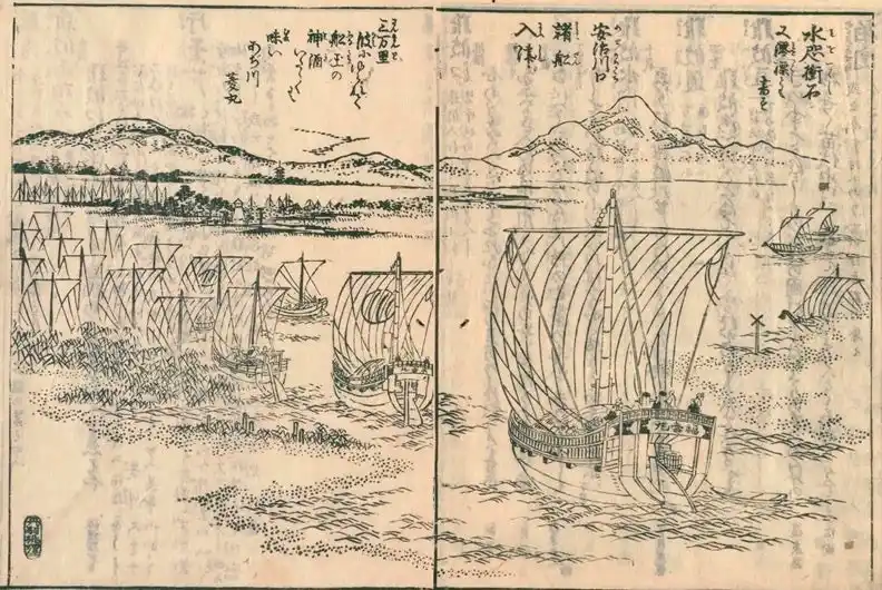 ・(※1)下り酒 江戸時代、上方(大坂や西宮、今津等)から江戸まで、上方産の清酒が海路・樽廻船などで運ばれ、江戸へ下るお酒ということで「下り酒」と呼ばれ、品質が高いことから評判を呼び「下り酒」が江戸で大層もてはやされました。(以下画像/出典:『攝津名所圖會』安治川口諸船入津より) |