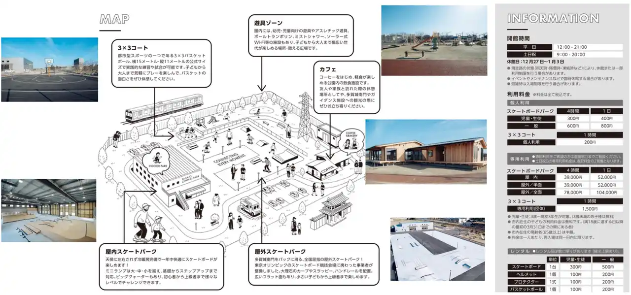 公園の全体像、開館時間、有料施設である屋内外スケートボードパーク、3x3コートの利用料金などは下記の通りです。 |