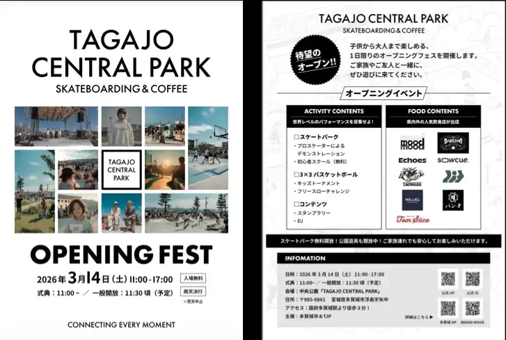 株式会社ミヤックス(代表取締役 社長執行役員:高橋蔵人、本社:宮城県仙台市)を代表構成団体とするTJP(*1)は、多賀城市の中央公園整備を進め、このたび日本屈指の規模を誇る屋外約3,600平方メートル 、屋内約900平方メートル のスケートボードパークを中心とした複合施設「TAGAJO CENTRAL PARK」を整備しました。3×3バスケットボールコートや遊具エリア、カフェ「Tagajo Central Park Coffee」などを備え、子どもから大人まで楽しめる都市型スポーツ公園として、2026年3月14日に開園、同日オープニングイベントを開催します |