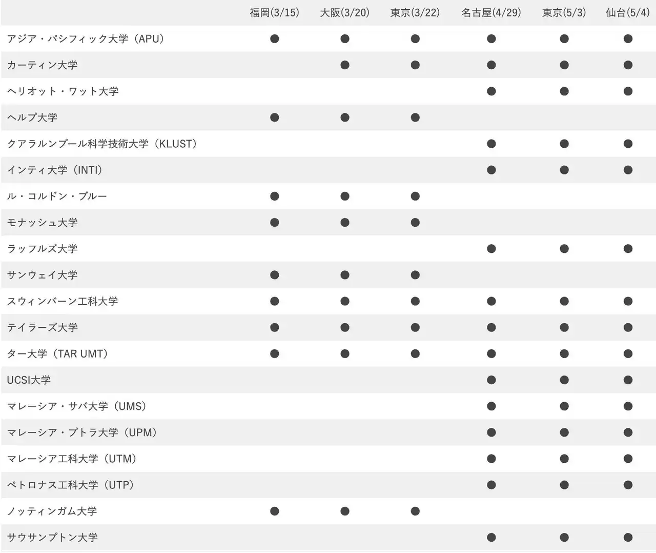参加大学と会場日程一覧 |