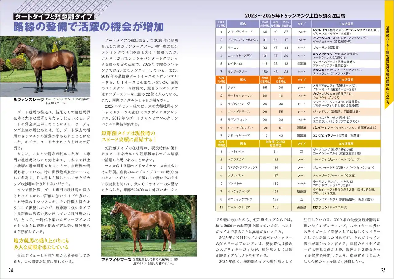 父ディープインパクトと父子で無敗の3冠を達成したコントレイルの期待の産駒がいよいよデビュー。25年の新種牡馬はそのほかにもダノンスマッシュ、ダノンプレミアム、インディチャンプ、クリソベリル、マテラスカイなど日本で活躍した馬、ミスチヴィアスアレックス、フィレンツェファイア、ヴァンゴッホ、ベンバトルなどの輸入馬たちと百花繚乱。これからが期待できる新進種牡馬の現在と可能性を徹底分析します。 |