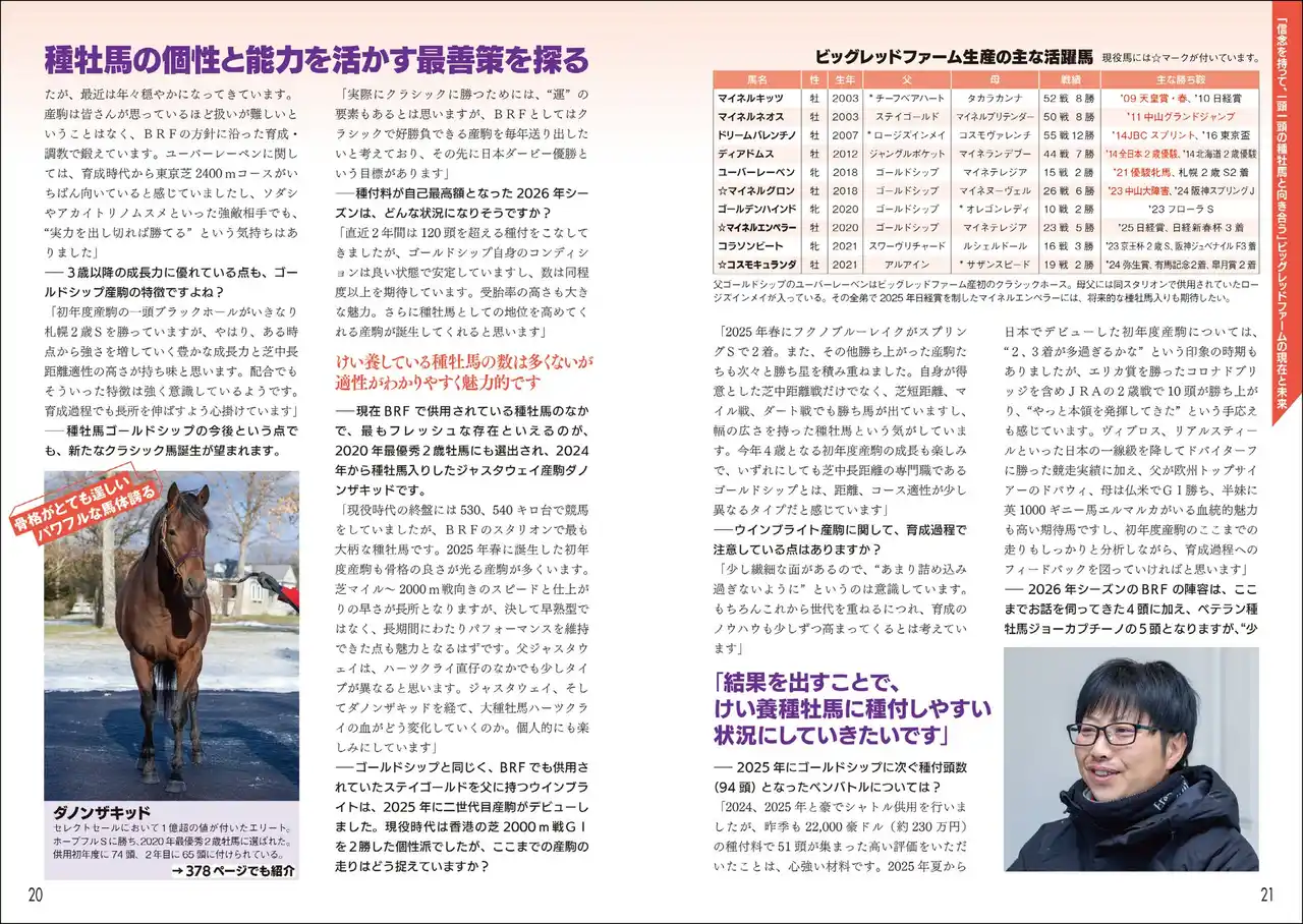 2025年種牡馬ゴールドシップの躍進が目覚ましい。宝塚記念を産駒のメイショウタバルが制し、マイネルエンペラーが日経賞を、フェアエールングが小倉牝馬Sに優勝。サイーアーランキングも7月現在9位と昨年の20位からランキングを急上昇させている。このゴールドシップを筆頭にベンバトル、ウインブライト、ダノンザキッドを繋養しているビッグレッドファームにインタビュー。種牡馬ゴールドシップのことを中心に、GI馬ユーバーレーベンやマイネルエンペラーの生産牧場としての姿や牧場としての今後の夢などもお聞きします。 |