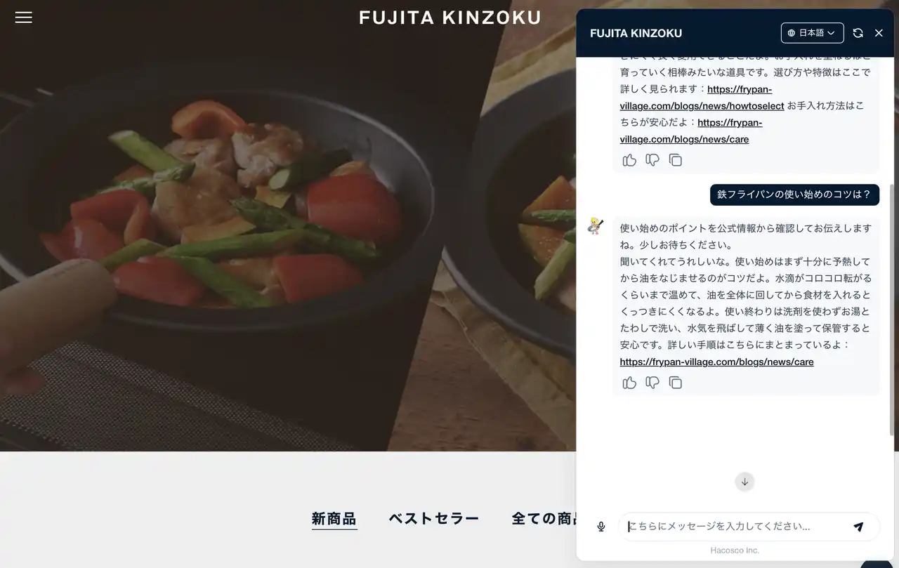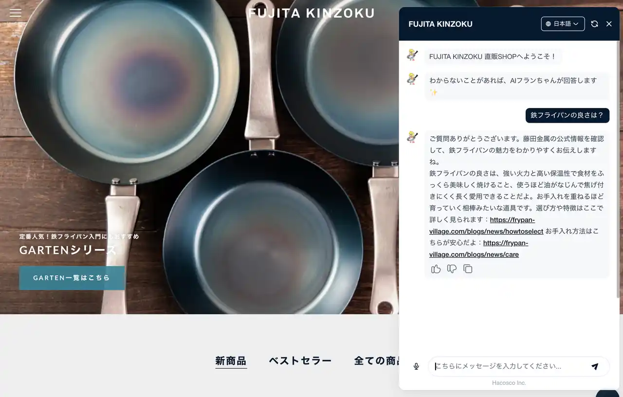公式ホームページ、公式オンラインサイトにて、AIチャットボットを導入しました。 |