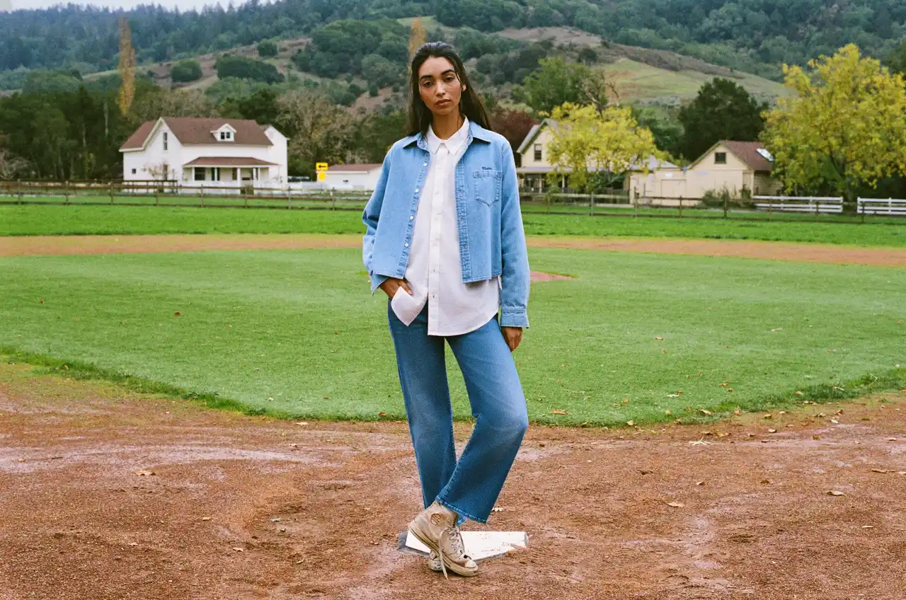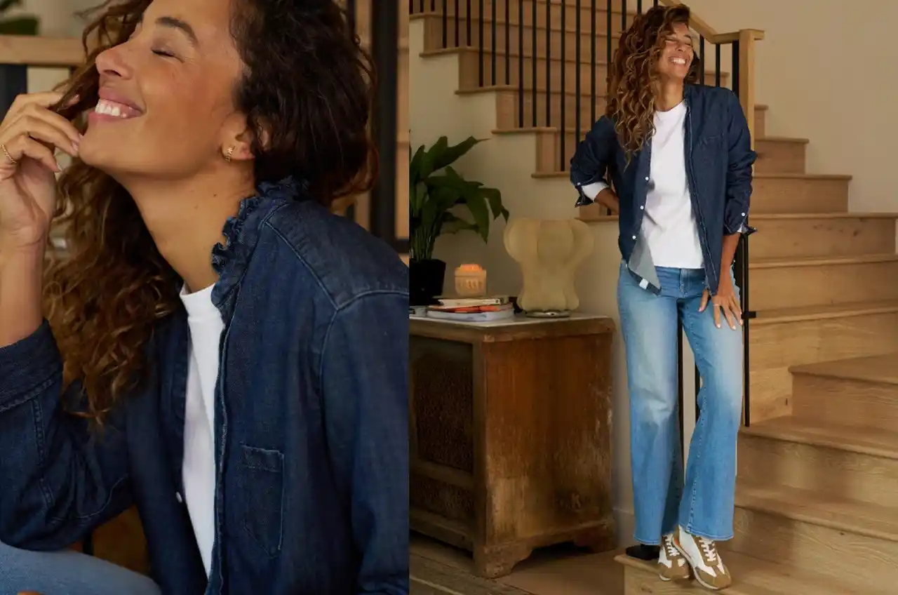 Frank&Eileenのシャツ、BAREFOOT DREAMSのラウンジウェア、BLEUFORÊT のソックス、SLEEPERSのビーチサンダル、そしてMOTHERのデニム。 |