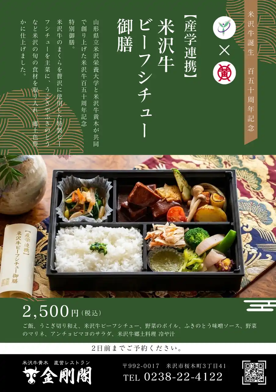山形県米沢市に所在する、管理栄養士の育成を目指す「米沢栄養大学」と、創業103年目の老舗「米沢牛黄木」が、コラボ商品「米沢牛ビーフシチュー御膳」を発売いたします。栄養大学4年生である疋田さん考案のメニューのもと、プロが腕を振るった渾身のお弁当を、お祝いの席などでぜひ! |