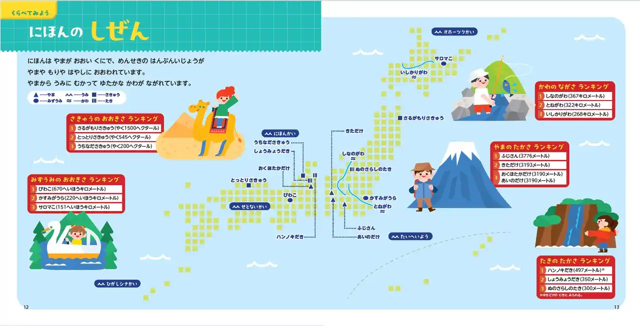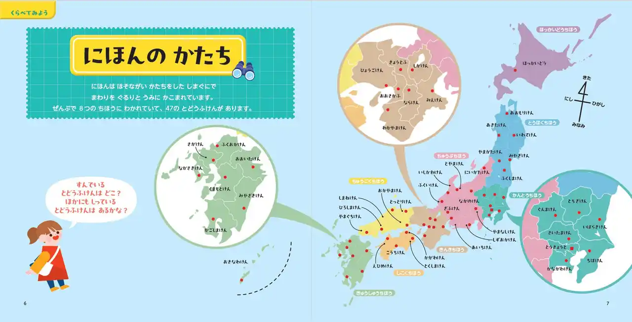 本書は、日本全国を「旅するように」楽しく学べる絵本。日本の形や地方区分からスタートし、北海道から沖縄まで、47都道府県の特色をかわいいイラストとわかりやすい文章で説明しています。 |