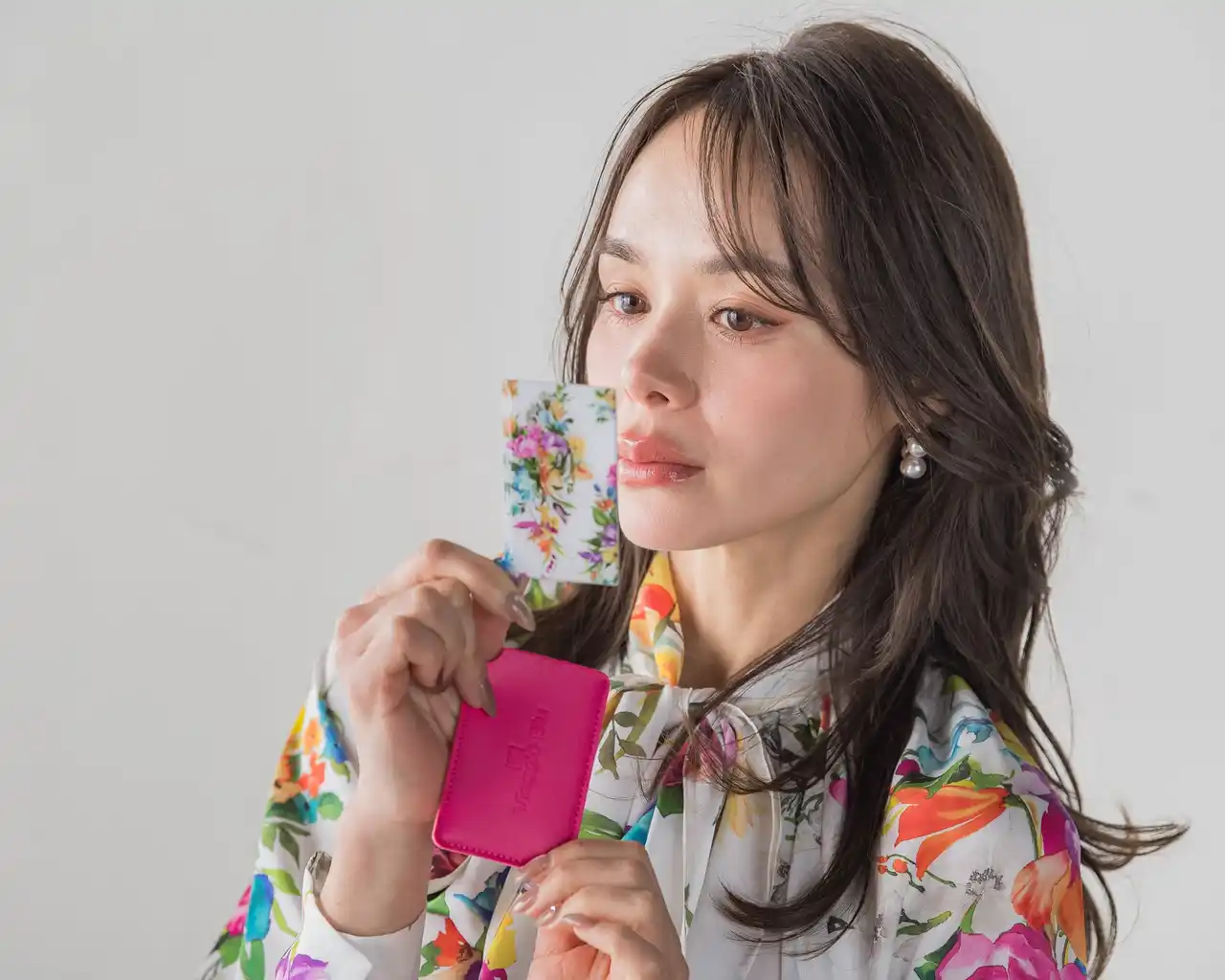 Viaggio Bluオリジナルプリントのブラウス&スカートと同プリントのコンパクトミラー。ビビッドカラーが春らしいケース付です。 |