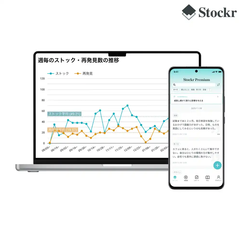 「Stockr」は、日々の出来事や気づきを書き残し、振り返る「書く習慣づくり」をサポートするサービスです。書くことによる振り返りは、メンタルケアだけでなく、生産性の向上にも寄与することが学術的にも示されています。 |