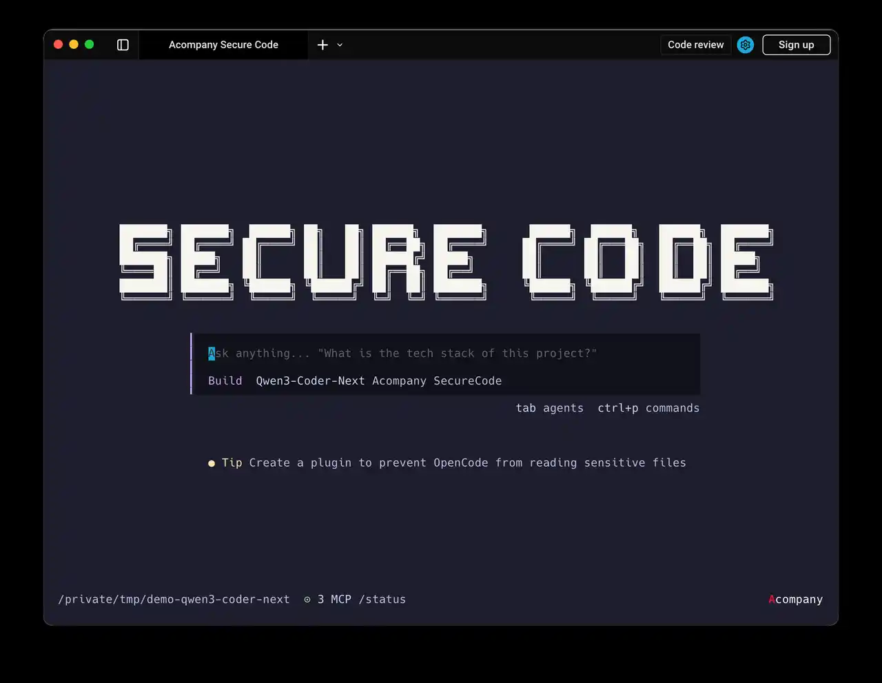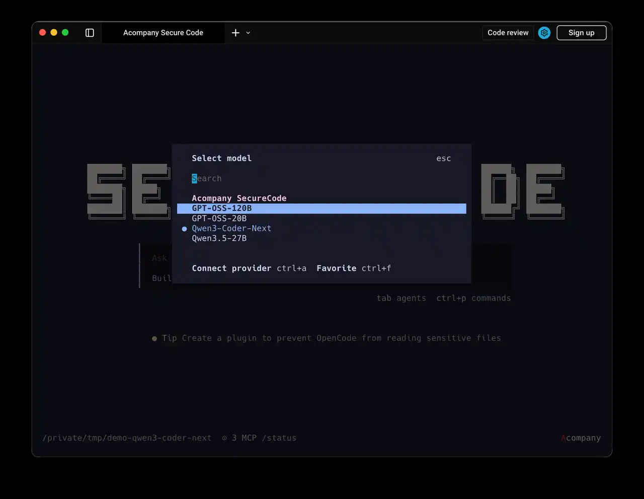 「Acompany セキュアコード」は、opencodeをベースとしたCoding Agentであり、Confidential Computing(秘密計算)インフラ上のLLMを利用可能なコーディング支援サービスです。 |