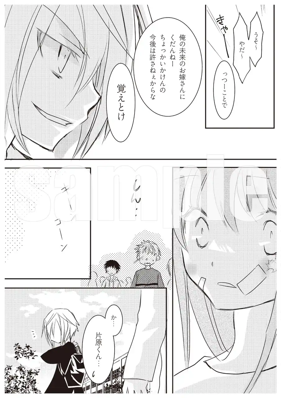 | 生まれつき頬にあざのある主人公のリエは、小さいころからいじめられていました。でも、騎士(ナイト)のようにリエの小学校に転校生として現れた真朝によって救われ、以来、真朝から「未来のお嫁さん」と呼ばれるようになります。そんな小学生時代のエピソードを交えながら、ホワイトデーのリエと真朝を描きます。 | ||||