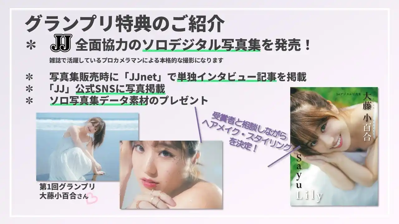 | 創刊50周年のファッションメディア「JJ」は、2024年以来となる「第2回ソロデジタル写真集オーディション」を開催いたします。見事グランプリに選ばれた1名は、「JJ」全面協力で制作されるソロデジタル写真集の出演権利が贈呈されます。 | |||