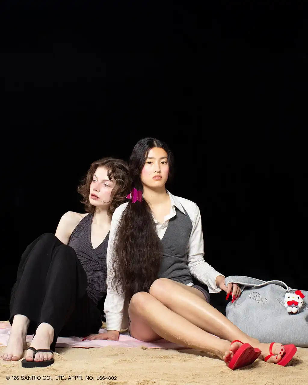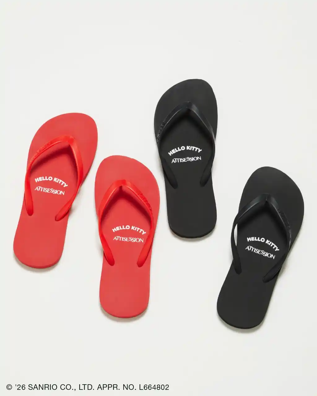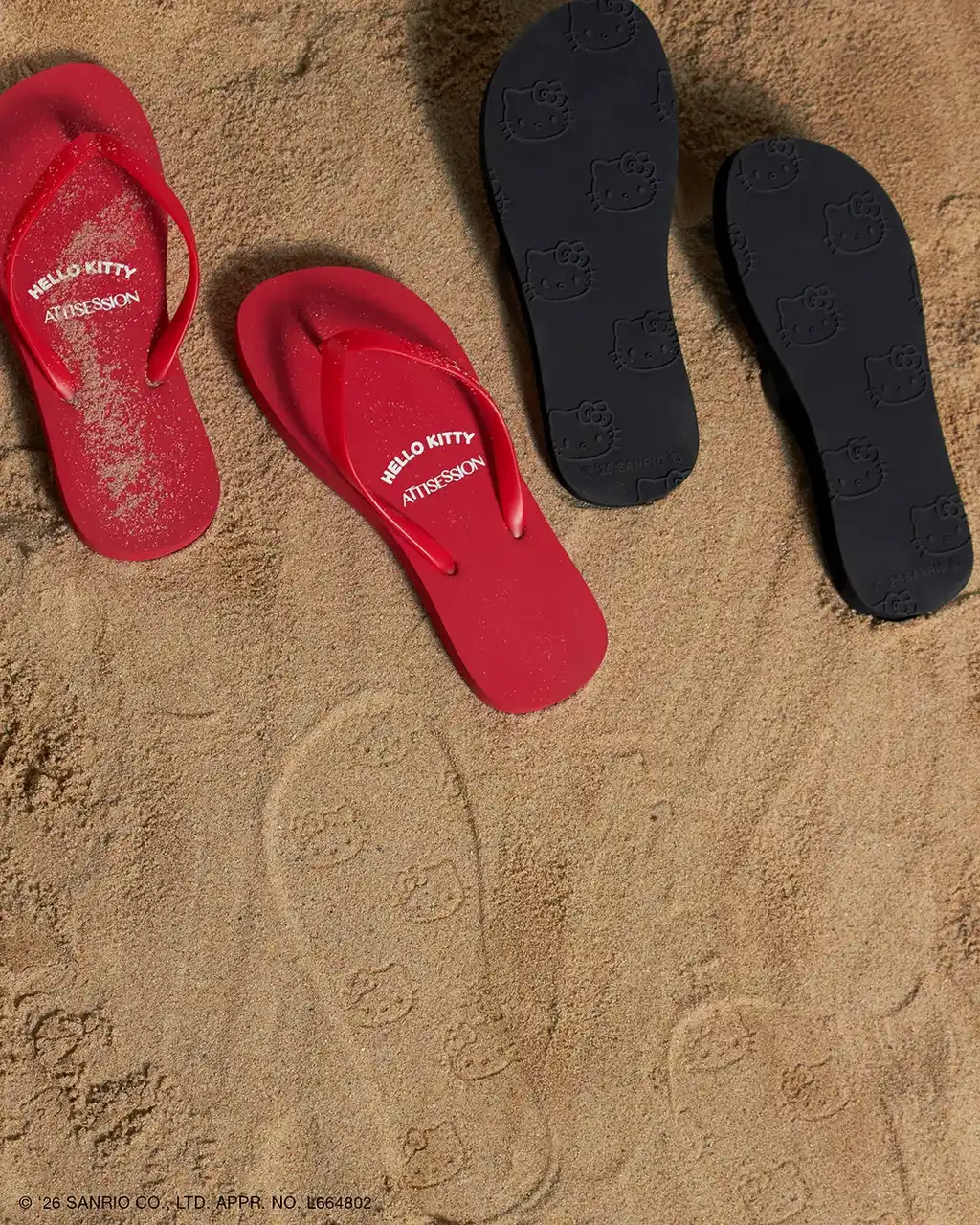 シンプルなデザインながら、見えないところに遊び心を忍ばせたビーチサンダル。ソール裏にハローキティの愛らしいフェイスモチーフをあしらい、砂浜ややわらかな地面を歩くたびに、ぽんっとハローキティの足あとが浮かび上がり、履くたびに笑顔になれる特別な一足です。シックなブラックと色鮮やかなレッドの2色をラインアップし、リゾートシーンからタウンユースまで活躍する万能なアイテム。 |