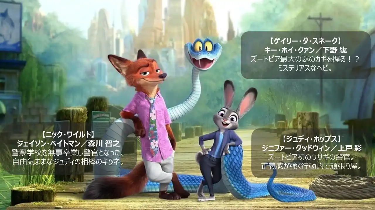 物語の主人公は前作に続いて頑張り屋なウサギのジュディと、皮肉屋だけど根はやさしいキツネのニック。警察官として再びバディを組んだジュディとニックが、100年ぶりに街に現れたヘビの存在をきっかけに、ズートピア誕生に隠された驚くべき秘密と真実を解き明かしていく感動のファンタジー・アドベンチャーです。 |