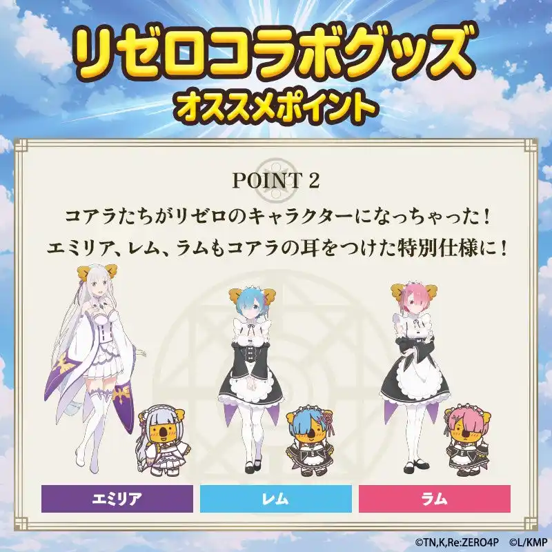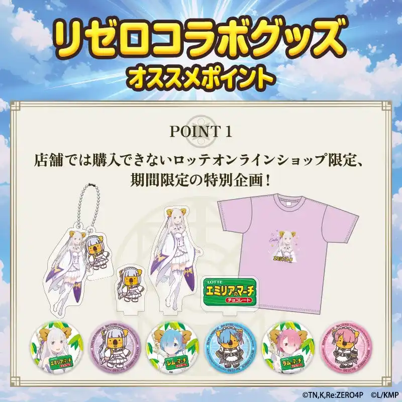 | 株式会社ロッテ(東京都新宿区、代表取締役社長執行役員:中島英樹)は3月16日(月)正午に、ロッテオンラインショップ限定でTVアニメ『Re:ゼロから始める異世界生活』と『コアラのマーチ』のコアラたちがコラボした特別グッズを4種類販売いたします。作品のキャラクターたちがコアラの耳をつけてかわいく大変身。さらに、各キャラクターをモチーフにしたコアラたちも登場します。ロッテオンラインショップにて、期間限定・受注生産となります。ぜひ詳細をご覧ください! | ||||||||||||
