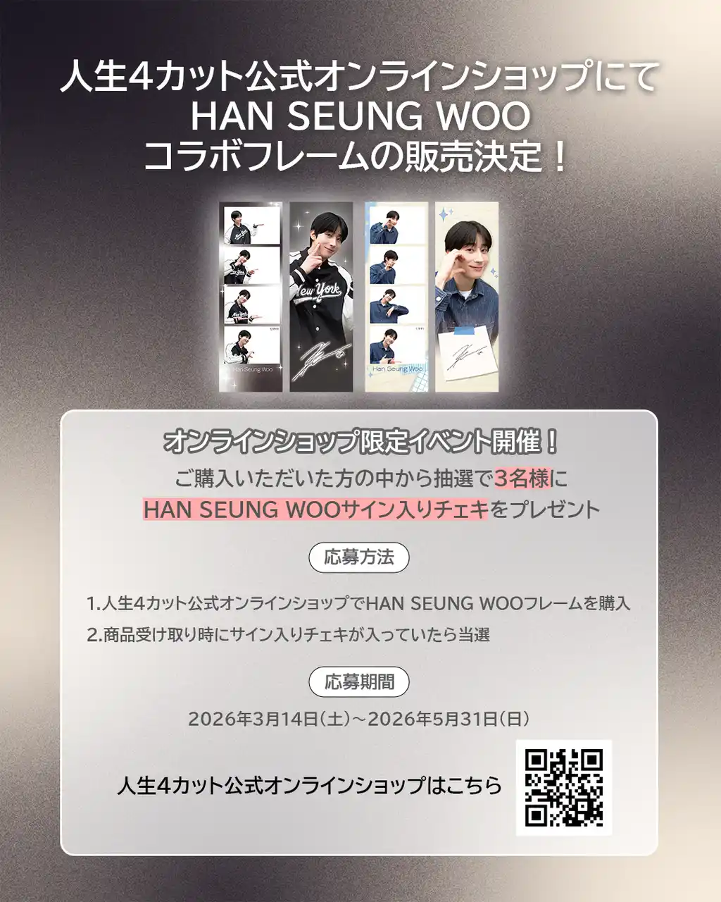 HAN SEUNG WOOと「人生4カット」のコラボレーションを記念して、ここでしか手に入らない豪華プレゼントが当たるSNSキャンペーンを開催いたします。 キャンペーンでは、HAN SEUNG WOO直筆サイン入りチェキや直筆サイン入り人生4カットフレームを抽選でプレゼント!HAN SEUNG WOOコラボフレームで撮影した写真を投稿するだけで簡単に参加できるチャンス。 ぜひこの機会に、HAN SEUNG WOOとの特別な思い出をゲットしてください。 |
