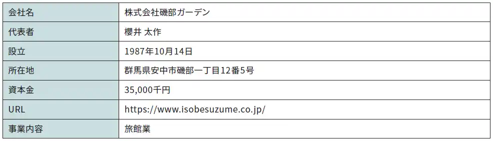 株式会社磯部ガーデン(代表取締役社長:櫻井 太作/本社:群馬県安中市/以下 同社)は、群馬県安中市で老舗旅館「舌切雀のお宿 磯部ガーデン」を運営しています。過疎化が進む温泉街で、同社は櫻井社長を中心に、温泉旅館の運営に留まらず、磯部温泉全体のにぎわい創出に向けて挑戦を続けています。 |