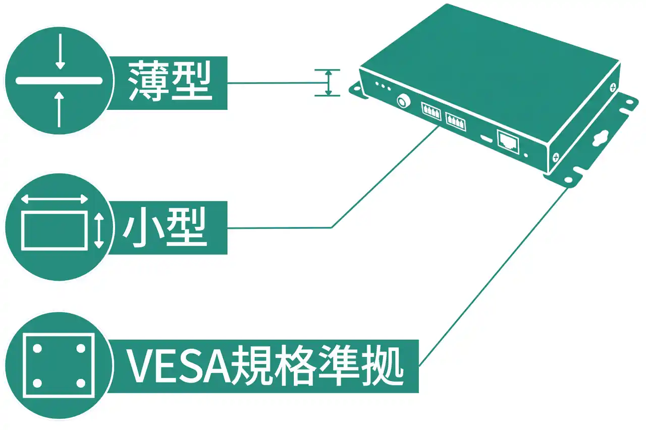 筐体サイズが薄型・小型設計のため、設置が容易です。オプションのブラケットはVESA規格に準拠しており、ネジ留めで装置などへの組込みが可能です。 |