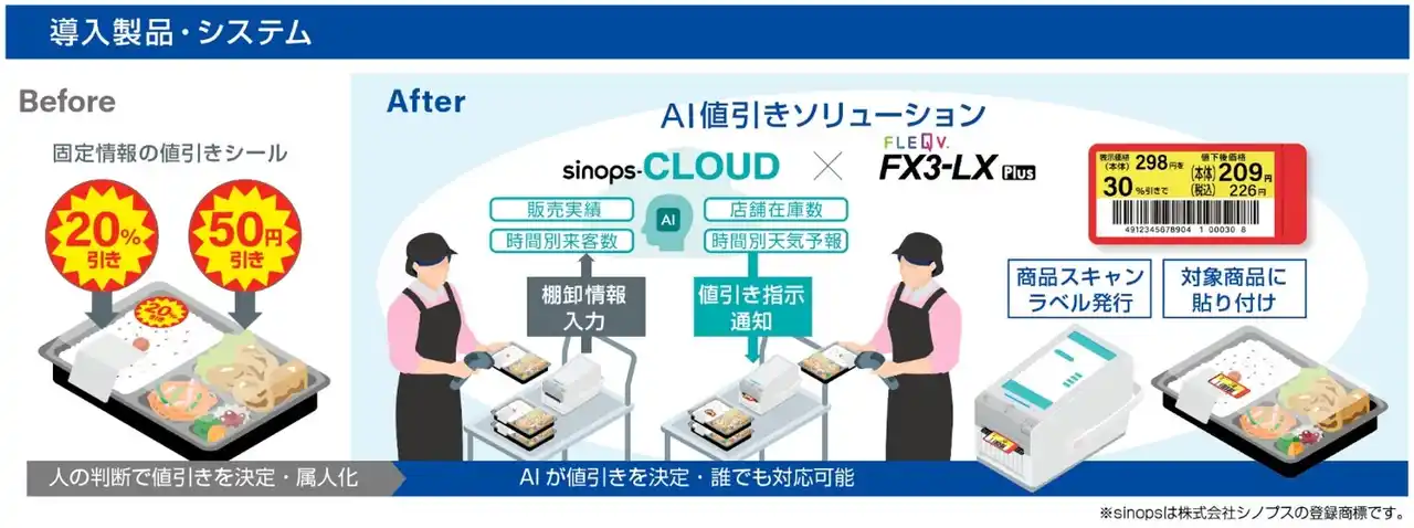 | サトーの次世代IoT搭載ラベルプリンター「FLEQV(R)(フレキューブ(R))FX3-LX」(以下、フレキューブ)に、シノプスの適切なタイミングで適切な値引き率をAIで算出するサービス「sinops-CLOUD AI値引」(以下、CLOUD AI値引)を連携させたソリューションです。CLOUD AI値引は、販売実績、販売価格、在庫、客数予測、天候など、さまざまなデータを基に、最適なタイミングと値引率を予測し、その結果は「値引アラート」として、フレキューブの画面に表示されます。売り場担当者は、該当の総菜のバーコードをスキャンするだけで、値引きラベルを発行できます。店頭でAIによる値引き判断からラベル発行まで一気通貫で行うことができ、店舗ごとや売り場ごとに判断していた値引き業務の標準化を実現するソリューションです。 | |||