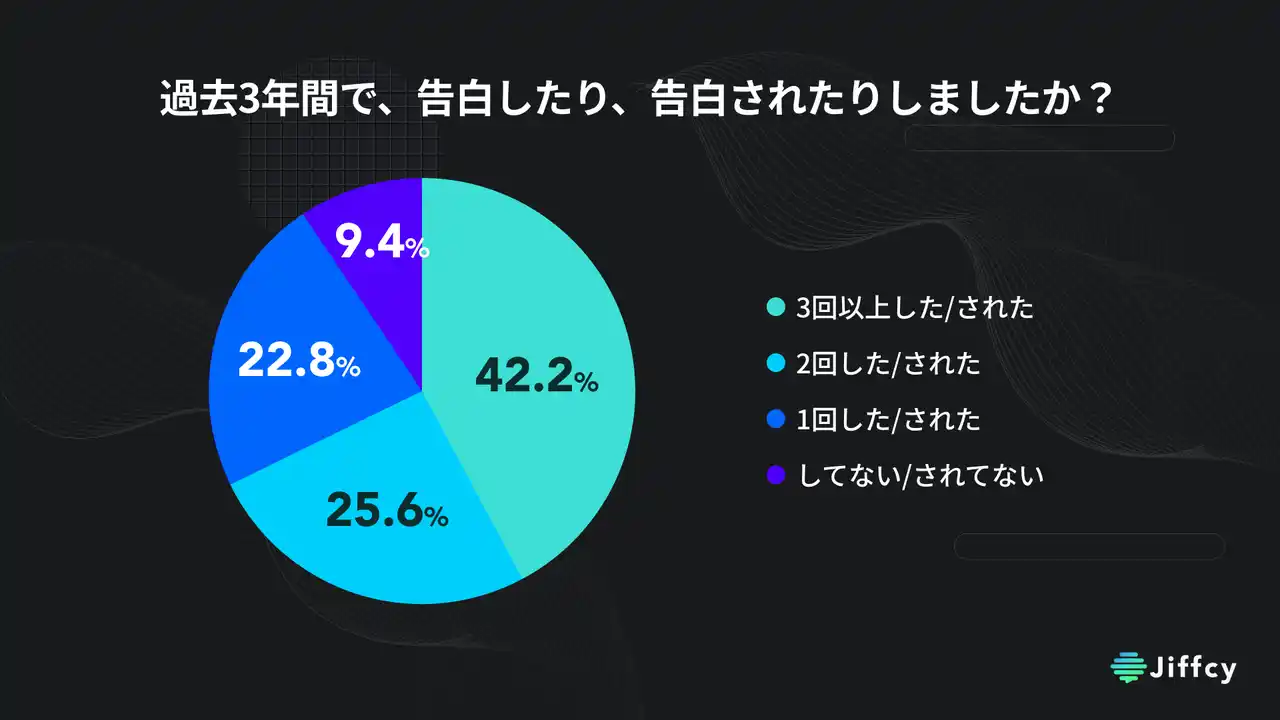 今回の調査で最も驚いたことは、「過去3年間で3回以上告白した/された」と回答したZ世代の方が4割にも上ったことです。昨今、若者は恋愛しないと言われていますが、むしろ積極的に恋愛を行なっており、告白をしていることがわかりました。 |