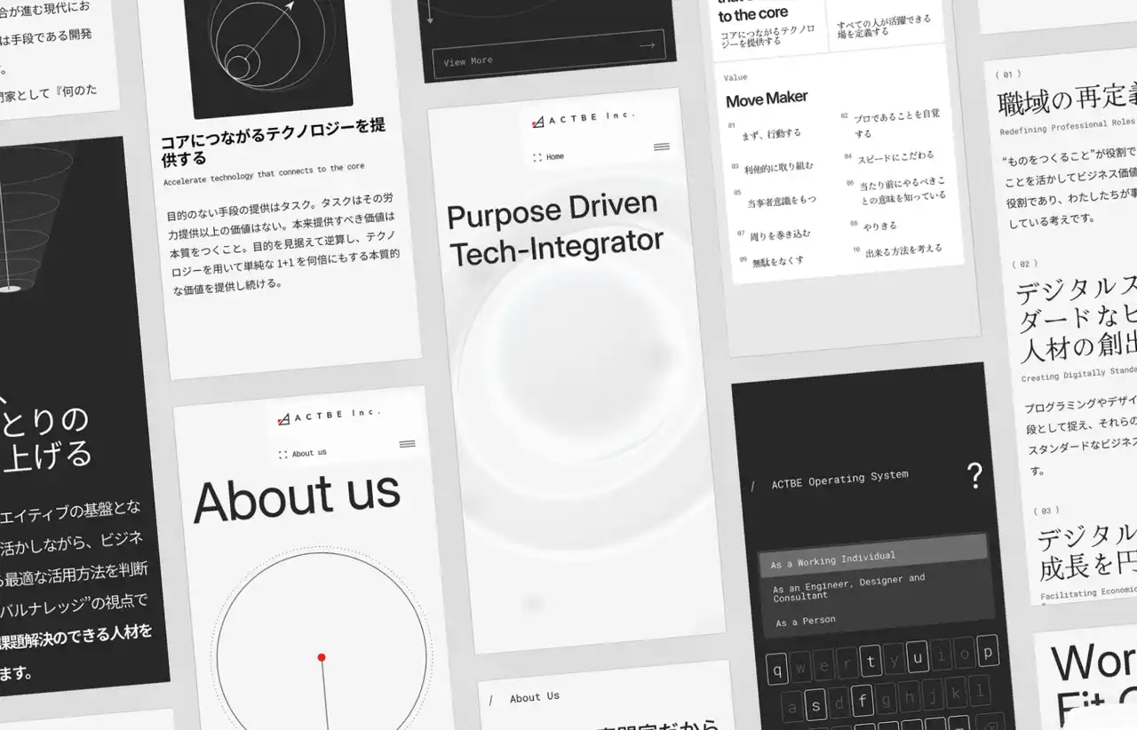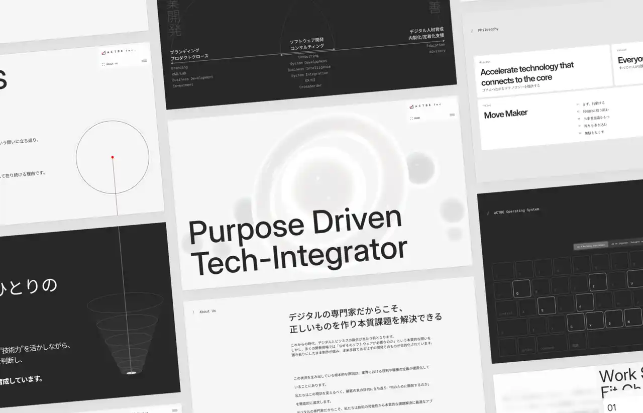 今回の受賞作となった本サイトも、まさにその思想を体現したものです。 根底にあるのは「アクトビの在るべき姿」への問いであり、サイト全体を通じて「Purpose Driven Tech-Integrator(パーパスドリブンテックインテグレータ(R))」というポジショニングを定義。私たちが何者であるかを、一貫したデザインで示しました。 |
