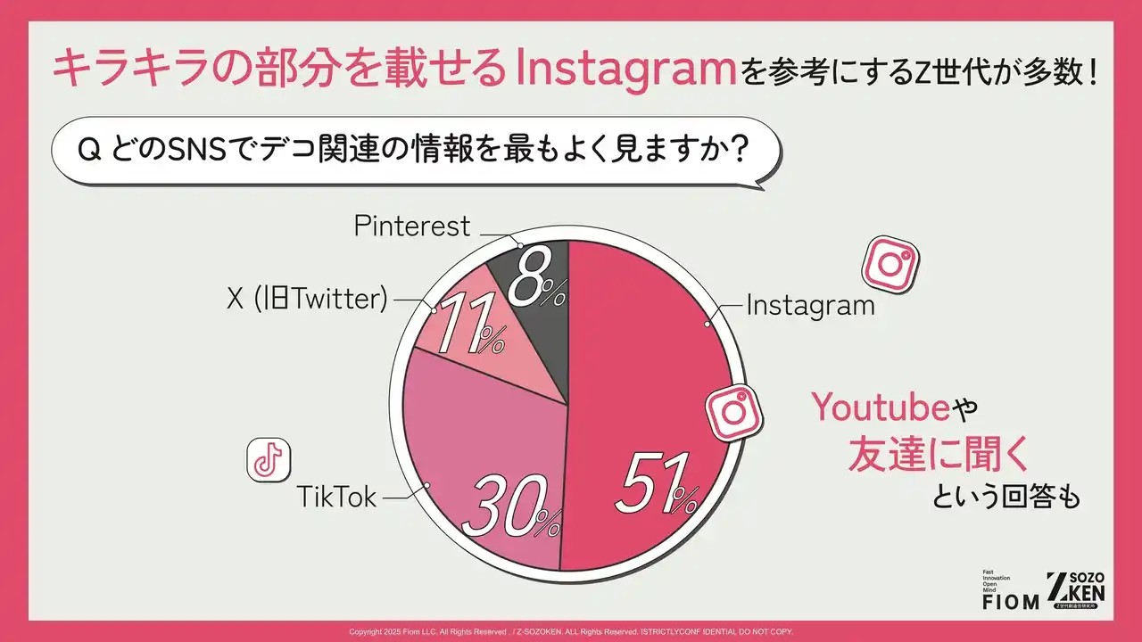 どのSNSでデコ関連の情報を最もよく見るかについては、「Instagram」が51%、「TikTok」が30%という結果に。キラキラの部分を載せるInstagramを参考にするZ世代が多数派を占めています。 |