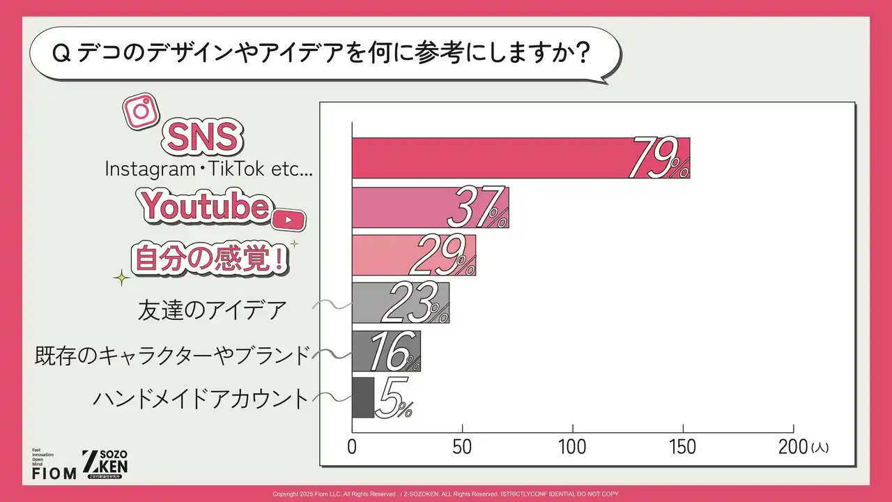 デコのデザインやアイデアを何に参考にするかという問いに対し、79%が「SNS(Instagram・TikTok etc...)」と回答。YouTube(37%)や自分の感覚(29%)を大きく引き離しています。 |