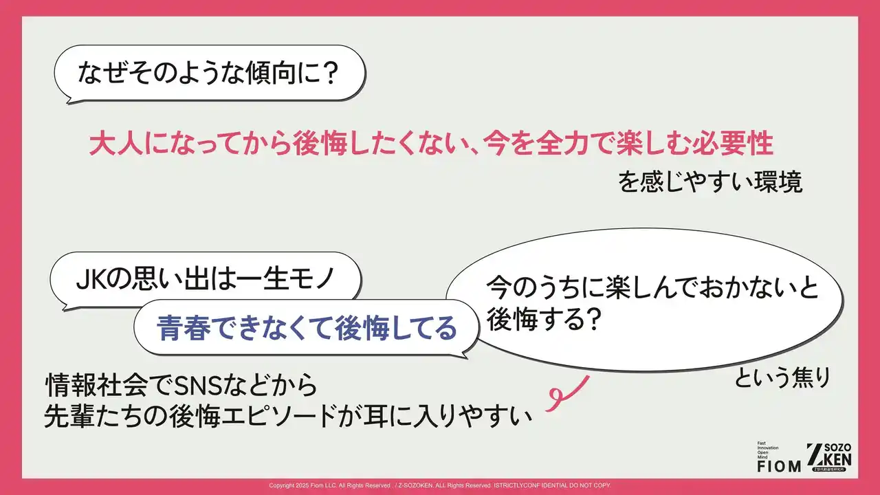 「大人になってから後悔したくない」「今のうちに楽しんでおかないと後悔する?」という焦りがZ世代には存在します。情報社会において、SNS経由で先輩たちの「青春できなくて後悔してる」という声が耳に入りやすい環境がこれを助長しています。 |