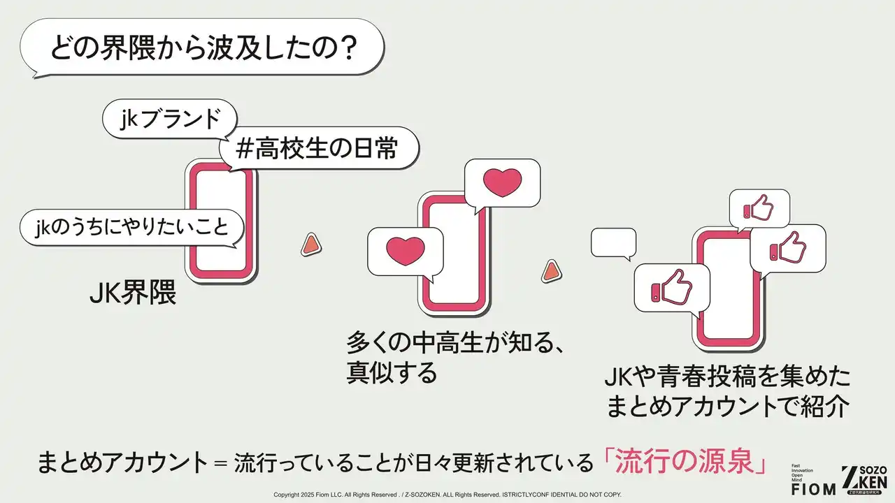 「JK界隈」から波及する文化は、多くの中高生が知り、真似する対象となっています。JKや青春投稿を集めたまとめアカウントで紹介されることで、それらが日々更新される「流行の源泉」となっています。 |