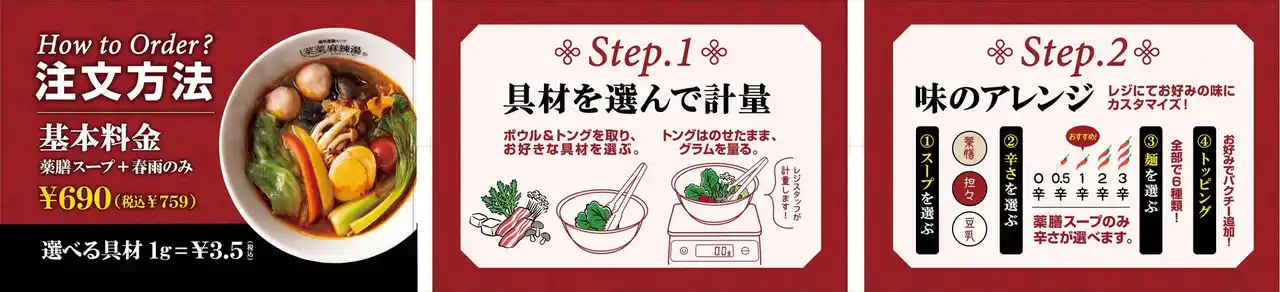 さらに、辛さが苦手な方にもお楽しみいただけるよう、坦々スープと豆乳スープもご用意しています。 |