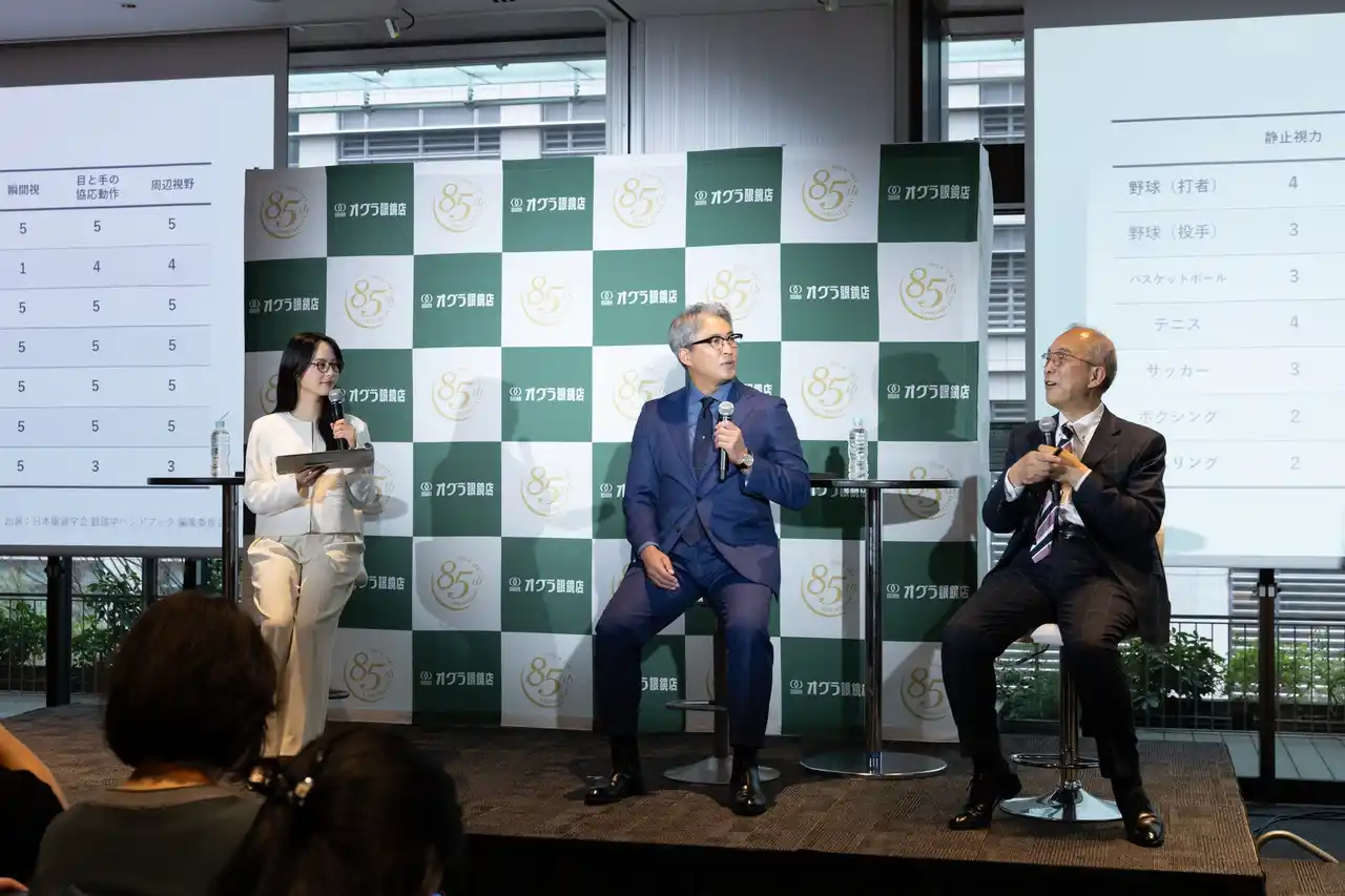 | 「なるほど! ドジャースのマックス・マンシー選手の例ですが、2025年にチームメイトのアドバイスを受けて、眼鏡を作り替えたら成績がアップしたのです。つい昨年の話です」と五十嵐さん。実際には、眼鏡を使用する野球選手は少なく、約80%の選手がコンタクトで視力補正をしていますが、視機能とパフォーマンスの関係はデータで証明されているそうです。「それで思い出すのが、現役を引退する際のインタビューでよく耳にする“ボールに対して目がついていかなくなった”という声です」と五十嵐さん。 「目とスポーツ、深く関係しているのですね。一流選手をめざすなら、この検査で自分の視機能を知ってから、トレーニングするという活用のしかたもあるかもしれませんね」と、山本萩子さん。視機能のプロからのお話に、来場者も聞き入りました。 | |||