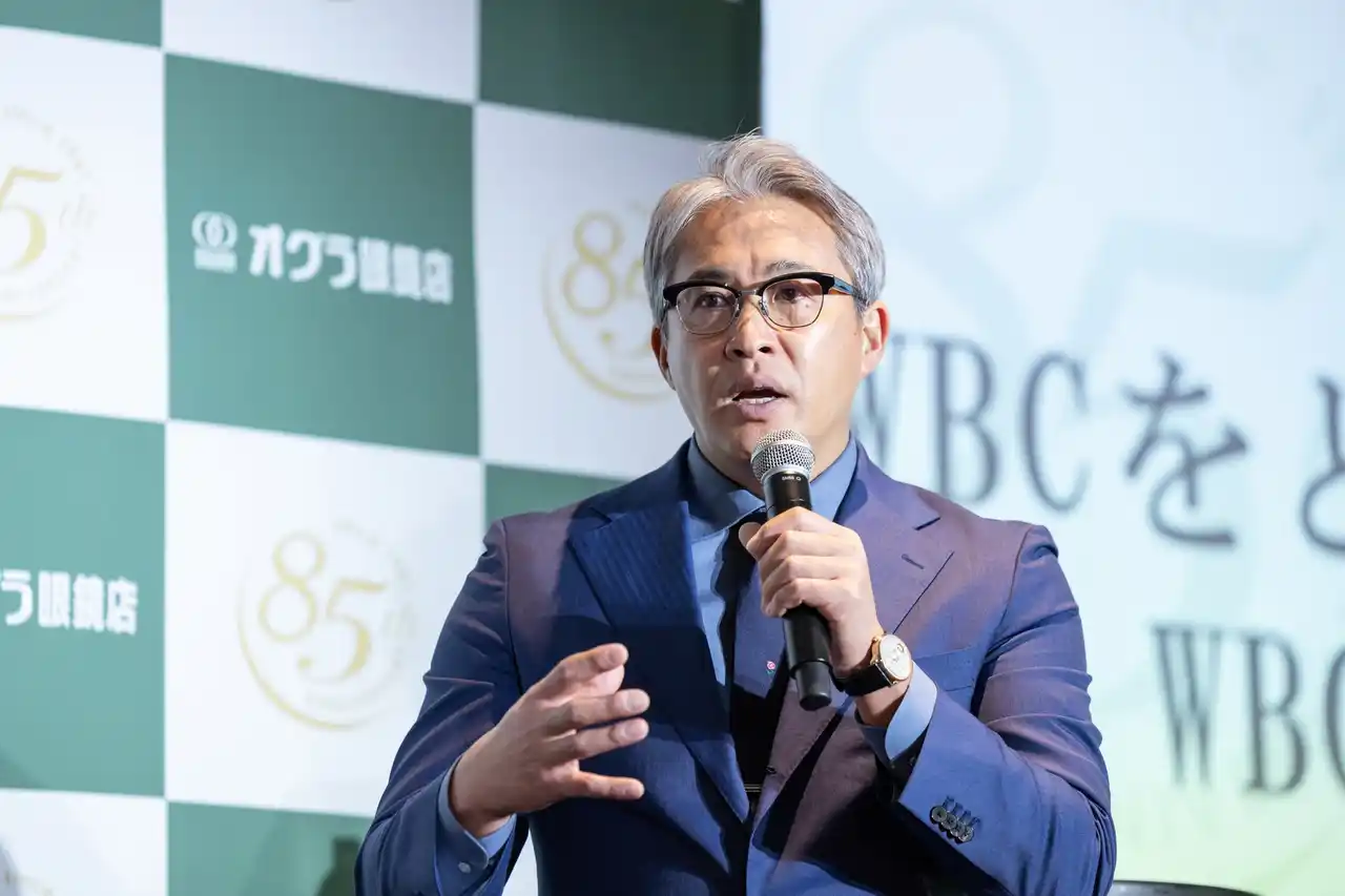| 「85周年構想モデルの発表とともに、メジャーリーグでも活躍し、現在は野球解説など幅広く活動されている、元野球選手、五十嵐亮太さんをお招きしております。40代からの目のライフステージをテーマにしたお話、また、WBC、世界野球国際大会についてのお話も伺えるのではないかと、楽しみにしております」。 | |||
