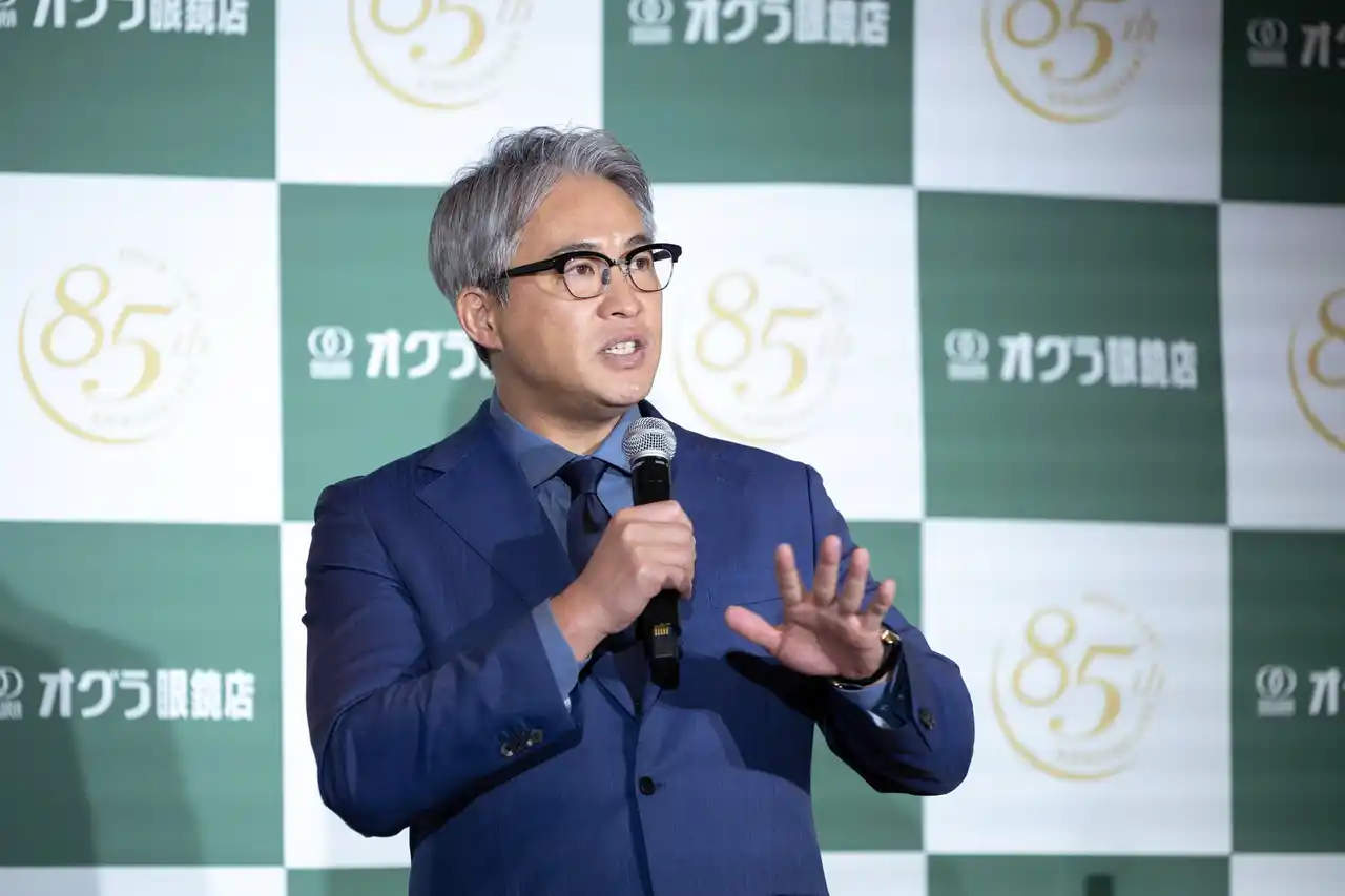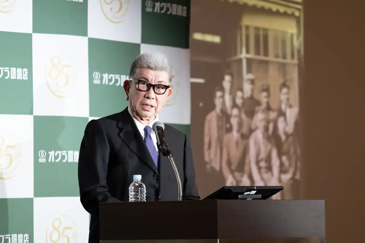 | 「“小倉眼鏡商店”、これが昭和16年、1941年に日本橋蛎殻町にて創業した時の会社名です。先代である創業者の“常に誠実であれ、お客様に対し誠意をもって目の知識をお伝えするように”との教えを実直に受け継ぎながら、現在は「オグラ眼鏡店」「こどもメガネ アンファン」を全国に40店舗を展開しております。おかげさまで2026年、弊社は創業85周年を迎えることができました」と代表取締役社長 小倉信典より感謝の意を込めた挨拶で会はスタートしました。 | |||