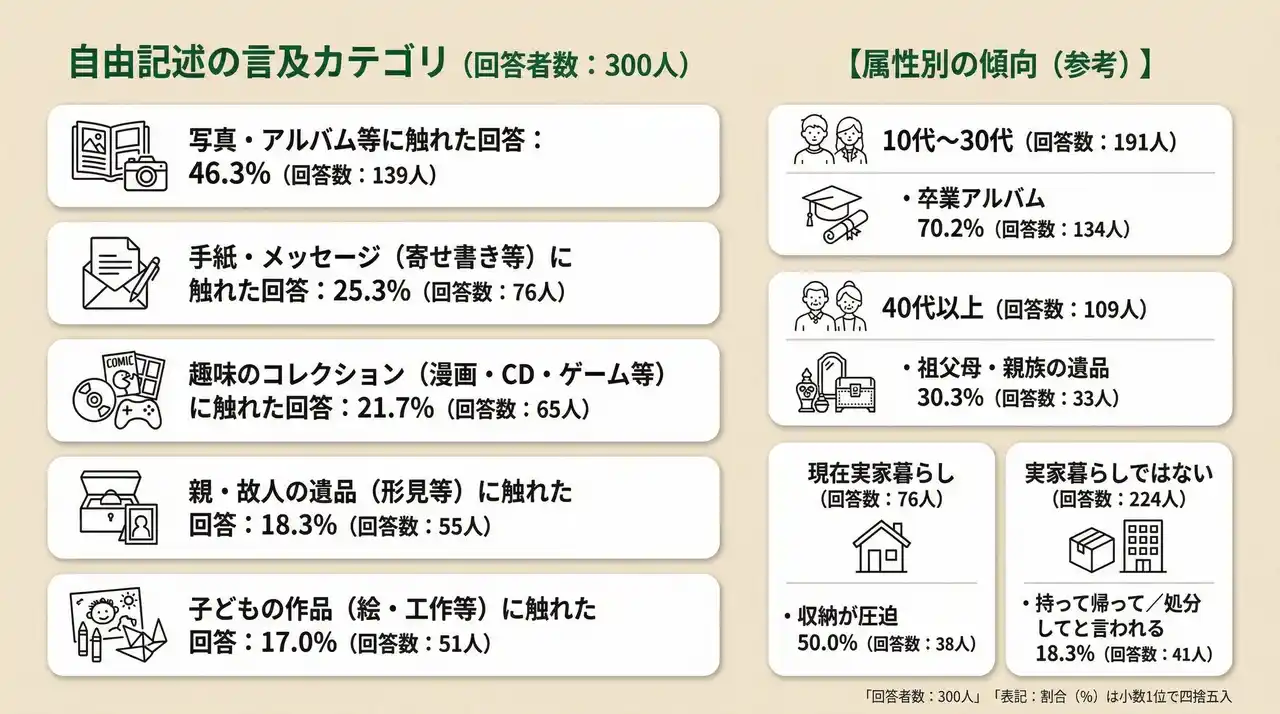 | 写真・アルバムが半数近くの自由記述で言及されている事実は、このテーマの中心性を裏付けています。単に古いから捨てるではなく、人生の記録、人とのつながり、家族の記憶が強く結びつくものほど、手放しにくい傾向がうかがえます。 | |||